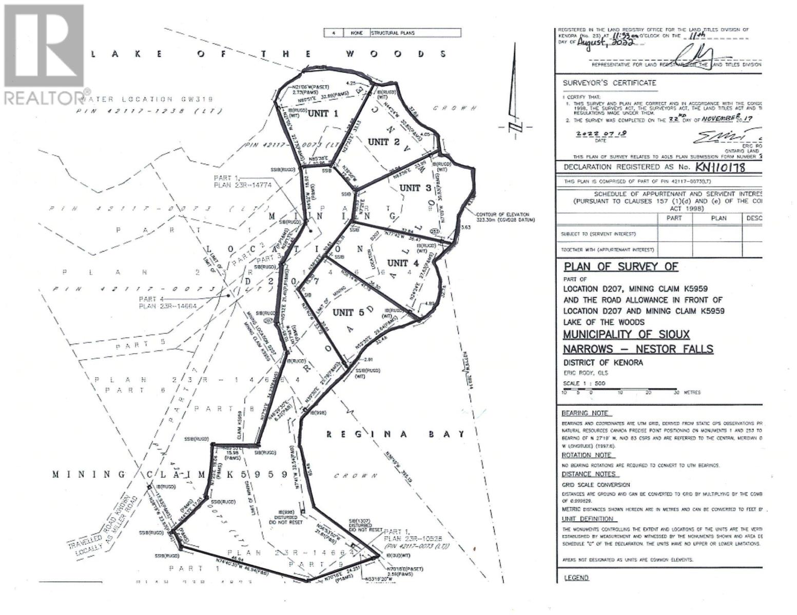 New Listing. An opportunity for a family compound or developer. Freehold vacant land condominium development. The waterfront property is comprised of five vacant land units (lots) plus common area. The entire property is approximately 1.8 acres in size with 894 feet of shoreline. The lands are a gentle topography with north, east and south exposure over Regina Bay, Lake of the Woods. Each vacant land unit features underground 200-amp electrical service on individual meters and underground septic service connection. The common area is landscaped and features a waterfront docking facility, walking paths, and septic system. Unit sizes are as follows; Unit 1; 8712 sq ft with 105 feet frontage; Unit 2; 8712 sq ft with 97.5 feet frontage; Unit 3: 9583 sq ft with 97 feet frontage; Unit 4; 9147 sq ft with 84 feet frontage; Unit 5; 8276 sq ft with 90 feet frontage. Each unit is permitted one residential dwelling to a maximum size of 1200 sq ft with a maximum of 2 bedrooms and 2 baths. An attached or detached garage is permitted. Condo Declaration and Design Scheme available. 2025 taxes: $3408.00. 13% HST applies to the purchase price. Viewing by appointment please. (id:34485)